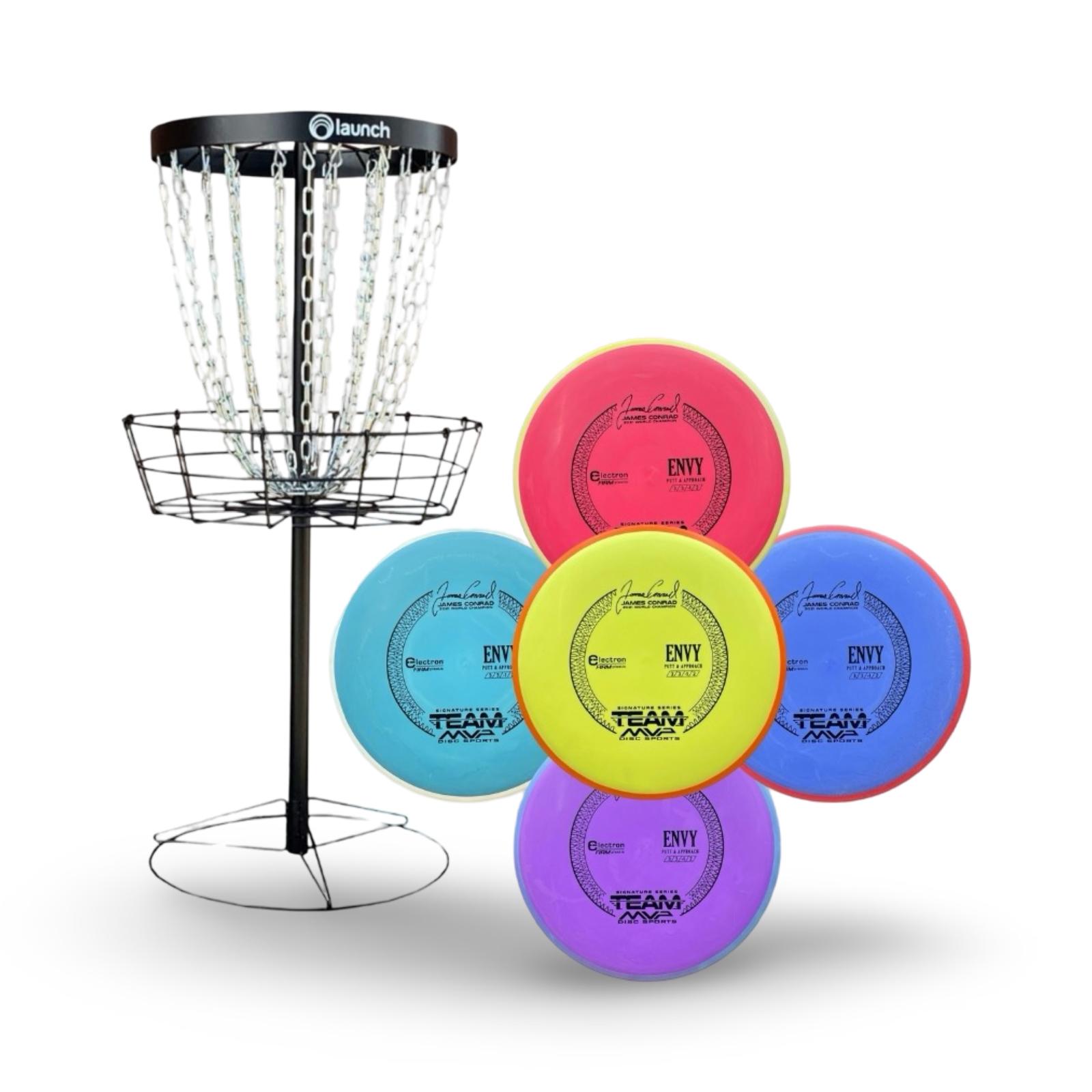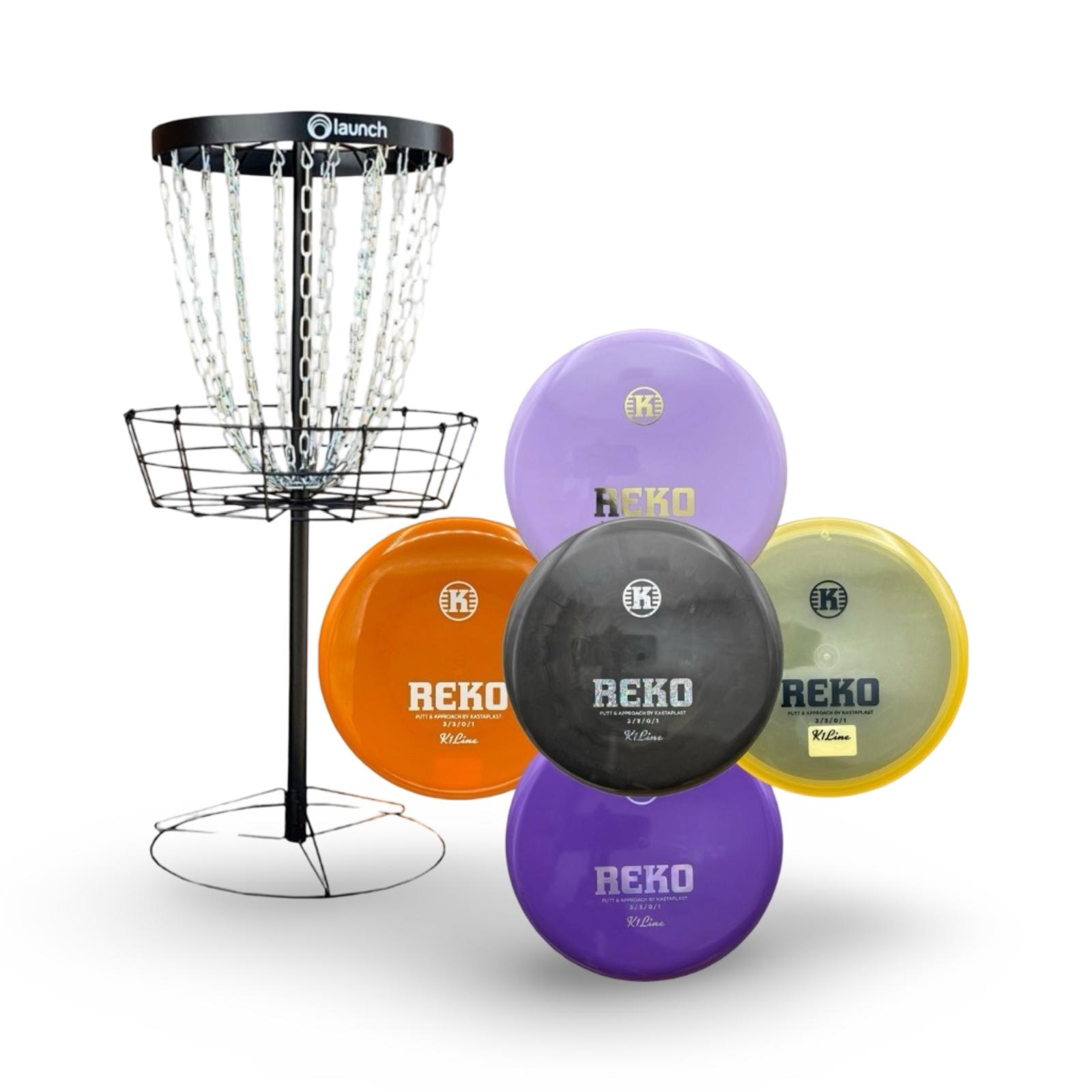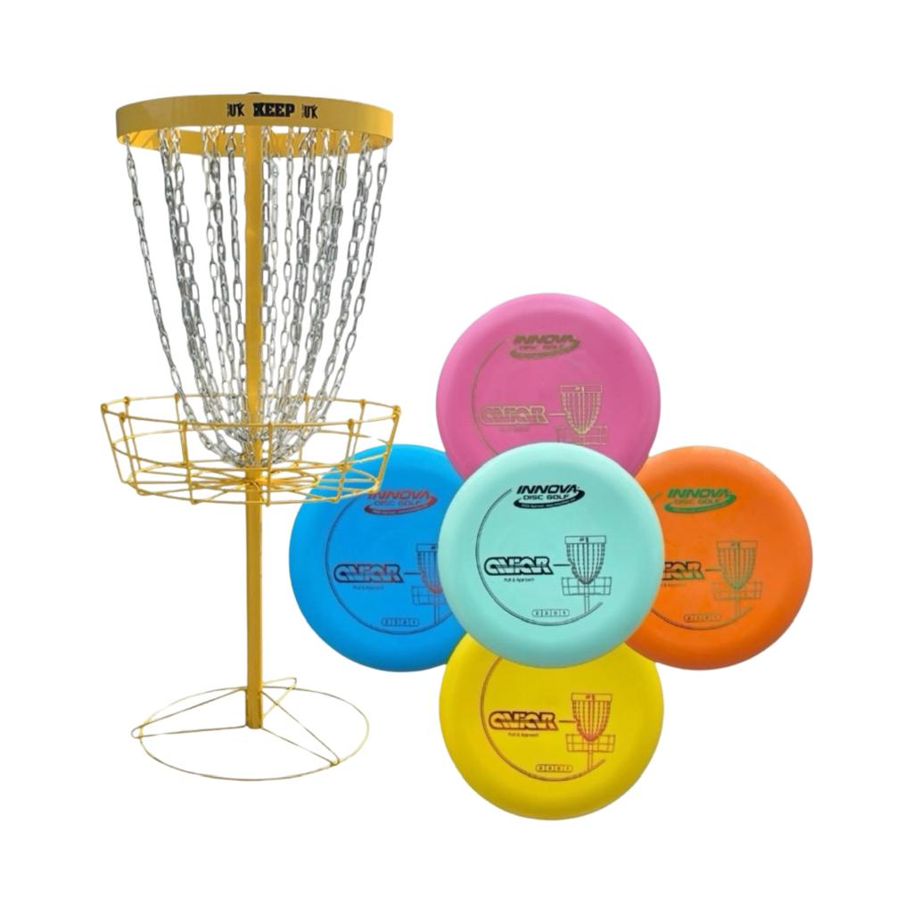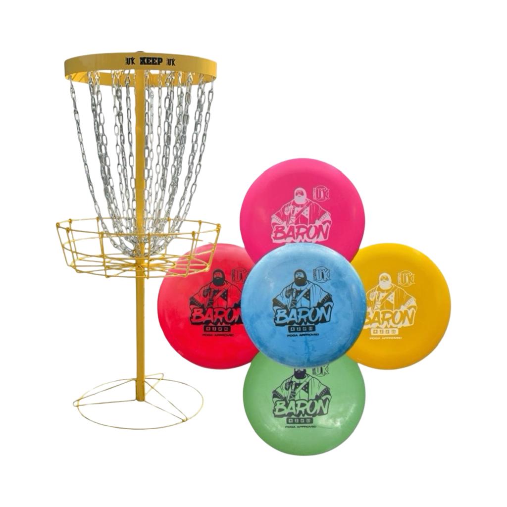This set includes a Black Keep basket, a durable and portable target designed for serious practice, bundled with 5 of the most popular putters from some of the biggest names in disc golf: